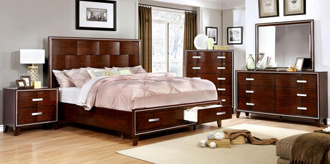 The perfect bedroom set to declutter and organize while maintaining style. This brown cherry finished bed set showcases unique geometric woodwork for a modern charm. Two footboard drawers and paired...