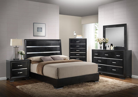 Textures and tones are provided with this master bedroom set. It features an espresso colored bed frame with a headboard textured with clean accents of silver lines. Set also includes...