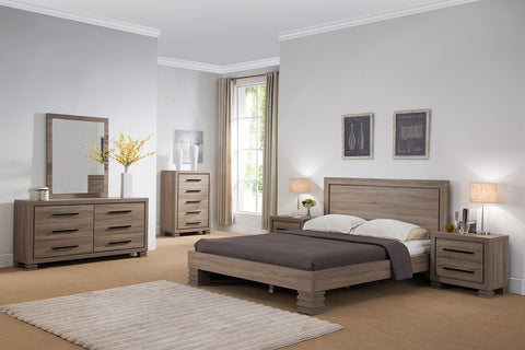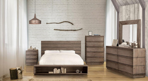 This weathered bedroom set is an attention-grabbing centerpiece for your bedroom decor. A high-profile head and low-sitting base structure with natural wood grain patterns create a comfortable appeal. Paired with...
