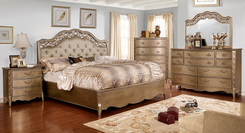 Brushed in a gleaming gold finish, this bedroom set offers sophisticated elegance. Brushed gold glows as it adds polished accents throughout the set. The tufted headboard focuses with flowing curves...
