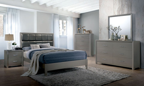 Experience true glamour with this silver finished bedroom set. Leatherette covers the high back headboard, adding smooth biscuit tufted accents for charming detail. Case goods provide plenty of storage while...