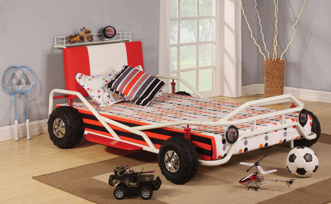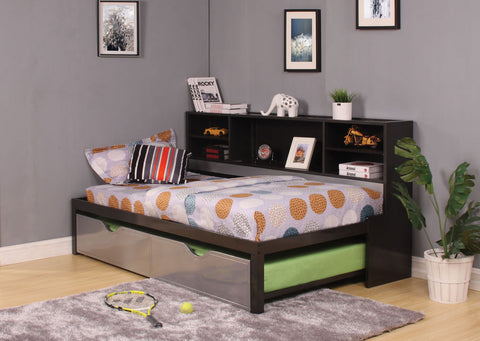 Twin bed frame with bookcase sideboard and secondary pull out trundle bed.