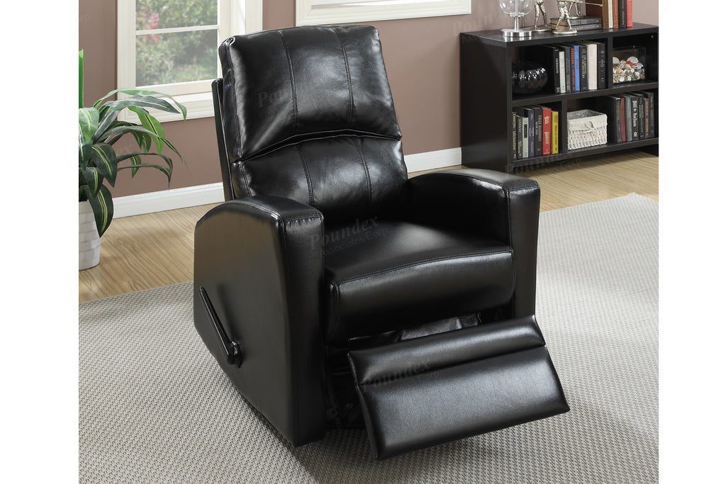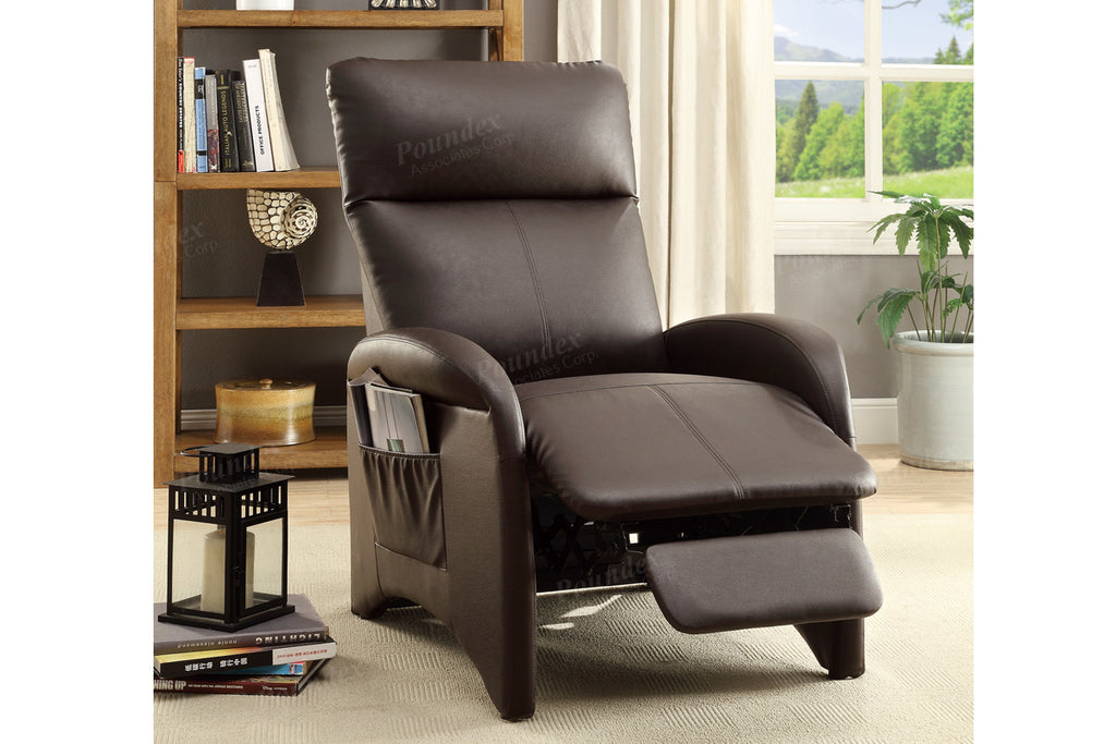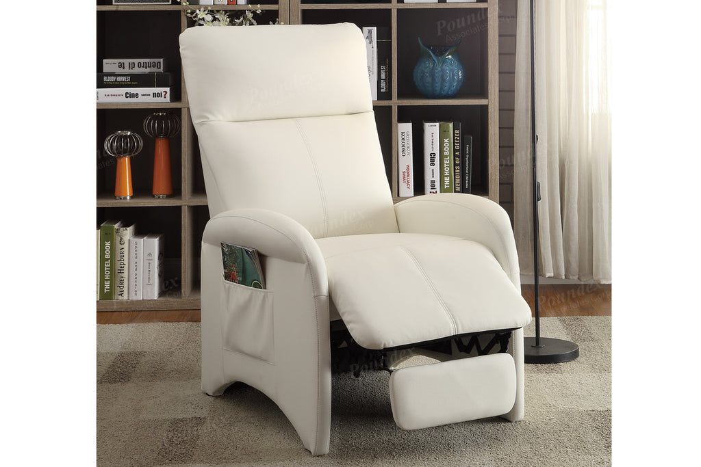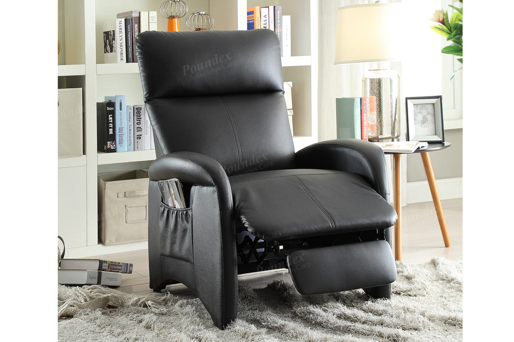 A futuristic design with functionality is delivered with this chic accent recliner chair. Upholstered in smooth faux leather, this chair features adjustable back support, wide seating area, and a plush headrest for extra comfort. It also includes side pockets for storing your remote controls or magazines. Available in black, espresso or white.