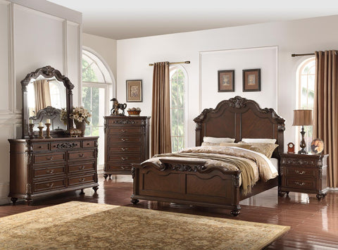 Fit for a queen, this bed frame features carved floral accents on the headboard and footboard. The traditional style upholstered panel with button tufting. HB 68"H ; FB 28"H, Dresser:...