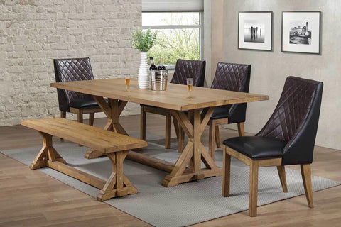 French farm style vintage oak dining table set includes: 1 table, 4 chairs, and 1 bench. Dining Table 83.75"l x 40.25"w x 30.00"h, Side Chair, Dark Brown 21.75"w x 24.50"d...