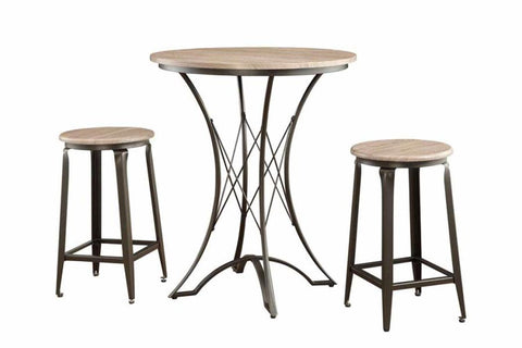 Three piece set with distressed wood table top and bar stool seats with a metal base finish in black. 30" Dia x 36" H, Bar stool: 14" W x 14"...