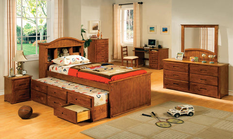 Convenience, extra storage and cottage style are hallmarks of this warm and inviting bedroom set. The platform-captain bed has a bookcase headboard and three drawers under a twin trundle. The...