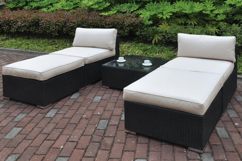 This 5 pcs outdoor set creates the perfect scenario for any back yard. Armless chair: 28"L x 34" W x 27"H, Ottoman: 28"L x 34" W x 17"H, Cocktail Table:...