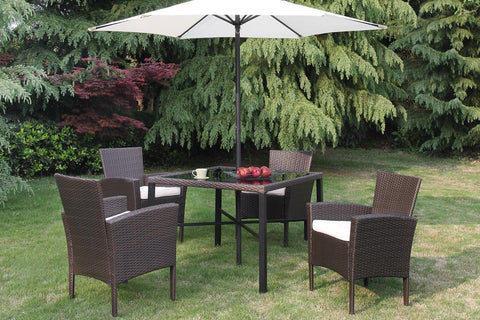 Compliment your outdoor home with our 6 piece Steel Frame PE Resin wicker table set. Includes: Table, umbrella, and 4 chairs. Table: 40 x 40" x 29"H, Chair: 25" x...