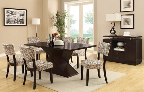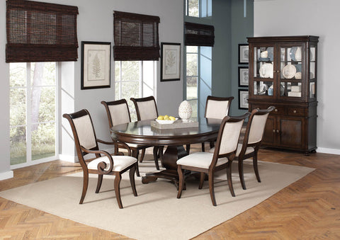 Imperial design is provided with this 7-piece dining room set perfect for large gatherings of family and friends. The rectangular shaped dining room table in covered in dark brown wood...