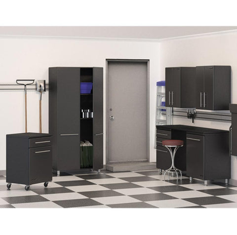 Seven (7) piece package gets you off to a great start with our most popular cabinets and 6' workstation. Features unique style with Polyurethane coated cabinet fronts in Graphite Grey...