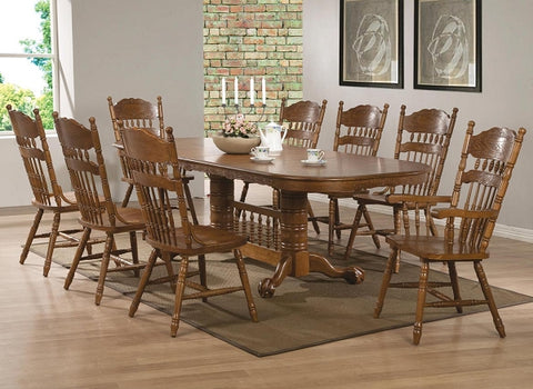 The centerpiece of this set is the beautiful pedestal table, which comes in two styles, adorned with intricate designs on the base and the apron. Two options for the side...