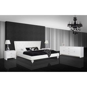 Transitional white leather bed Strong and sturdy construction Elegant Style Tufted padded headboard Excellent Craftsmanship Unique Design Queen Bed: W74" x D89" x H45"East. King Bed: W90" x D89" x...