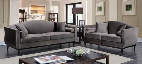 Soothe your senses with this dark gray sofa set. Curvy arms are filled with dense foam cushions, delivering luxurious comfort. Arching camelback designs peak along the backs and pointed legs...