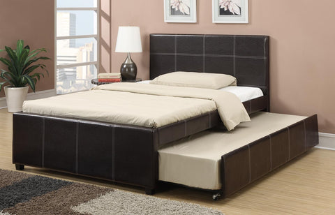 Adventurous in design and sleek in rich color and texture, this twin bed features a complete unit covered in espresso colored faux leather and includes a lower trundle for an...
