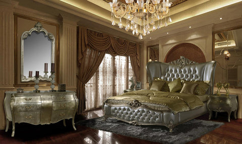 Elegant Eastern and Cal King Bed Frame Headboard: 94"L x 65"W x 9"H , Dresser: 83"L x 23"W x 38"H, Mirror: 57"L x 43"W x 4"H, Night Stand:32"L x 21"W...
