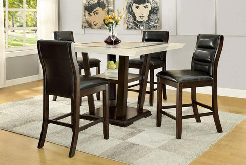 Uniquely designed and arranged, this pub table set conserves space without sacrificing the dining experience. The counter height table is crafted from cappuccino finished wood and a faux marble top...
