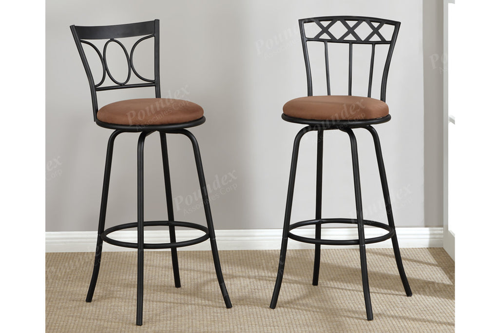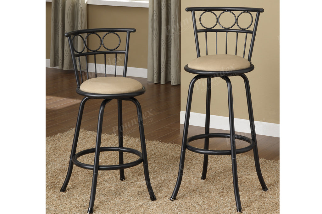 This barstool collection features a selection of two contemporary styled chairs with round upholstered seat cushions in a light color framed in a dark metal finish with bold lines covering the chair supports.