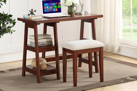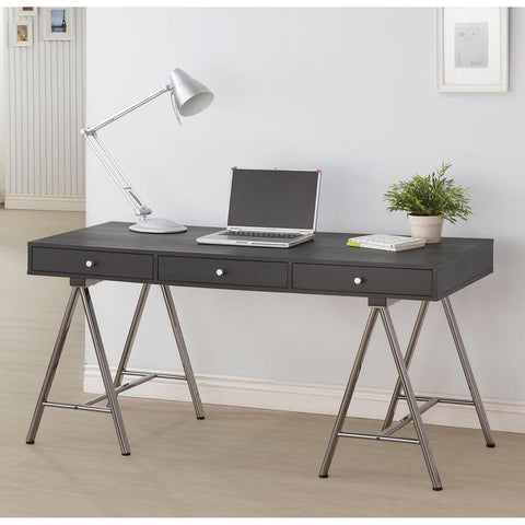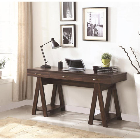 Sawhorse style desk finished in dark walnutDesk features three storage drawers Dimensions:Width: 60 x Depth: 23.25 x Height: 30
