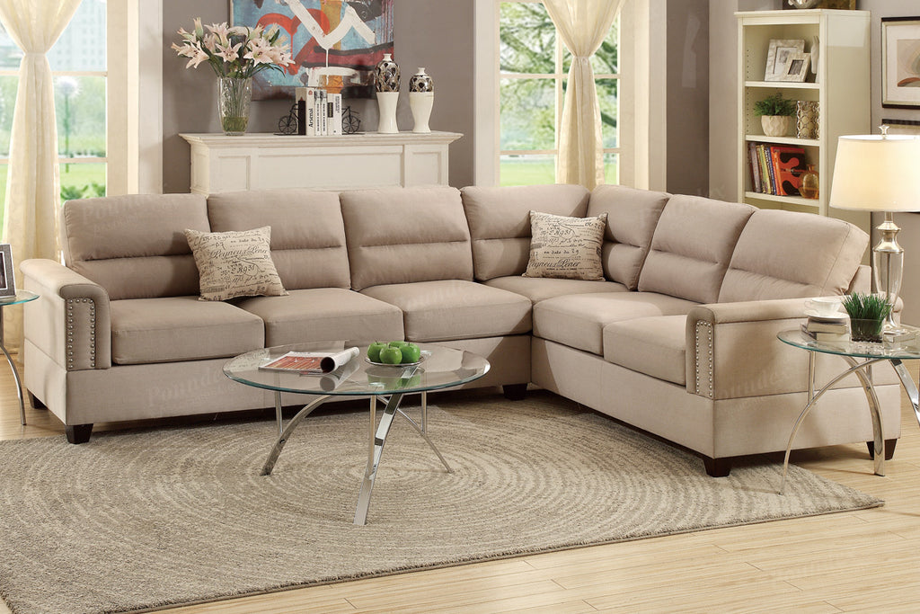 A charming combination of smooth bonded leather and plush seating is delivered with this 2-piece sectional that includes two-tiered pillow style back supports and silver stud trim on the arm rest. Collection also includes accent pillows with script patterns. Available in espresso (bonded leather) and sand (polyfiber).