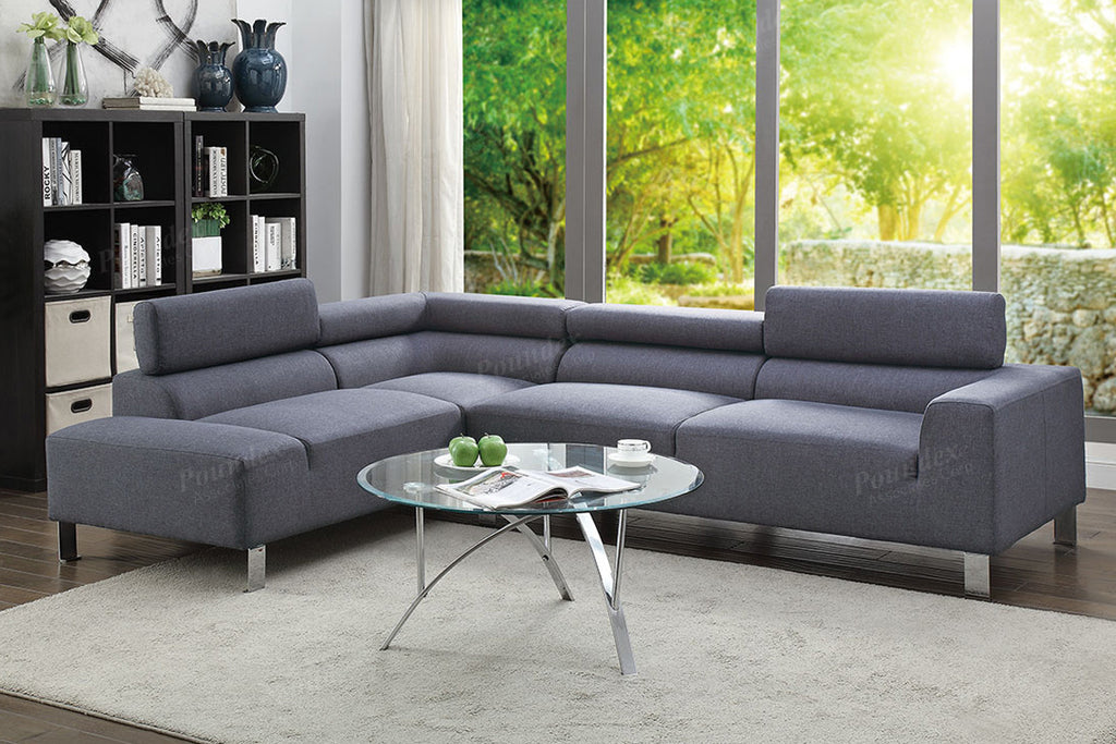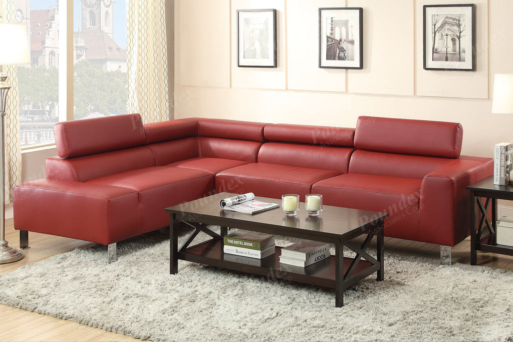 Flex your style with this futuristic 2-piece sectional sofa that features clean and sleek lines. Each piece includes adjustable head rests and wide seating and chrome accent support legs. Available in espresso and burgundy (Bonded Leather only), and tan and blue (Blended Linen only).