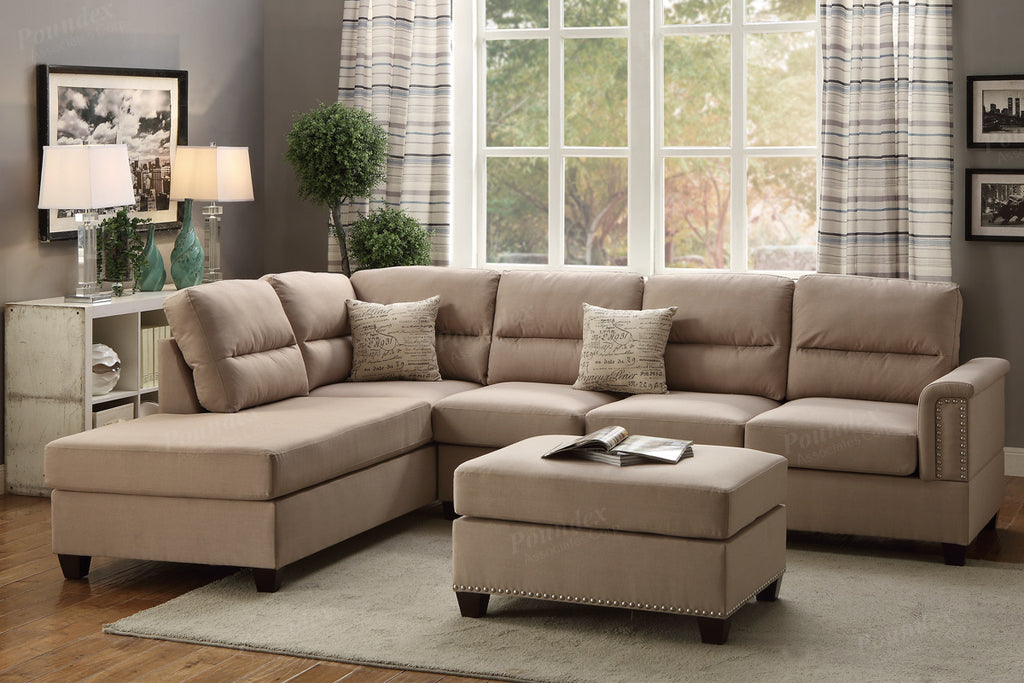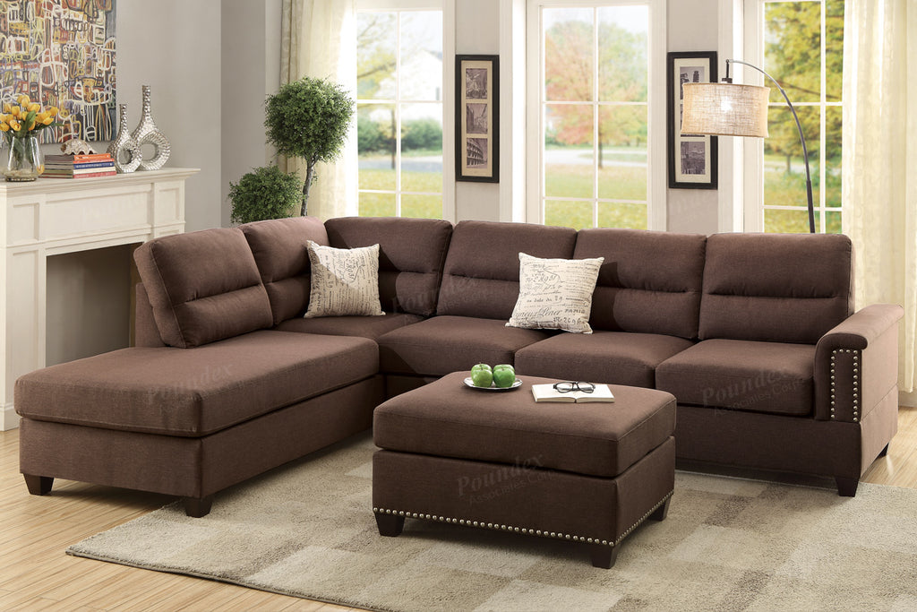 Functional style is defined with this 3-piece sectional sofa set that includes a large seating space, double tiered pillow cushion back support and arm rest trimmed in nickel finished studs. It also features a reversible chaise and accent cocktail ottoman with matching stud trim. Available in espresso and white bonded leather, and chocolate and sand polyfiber.