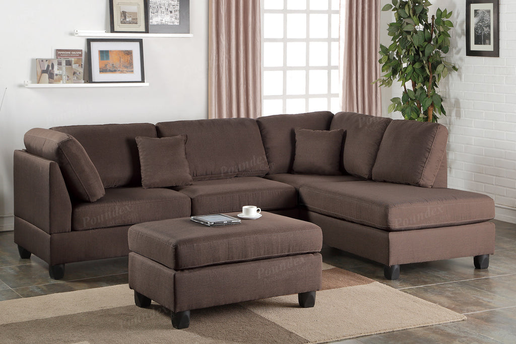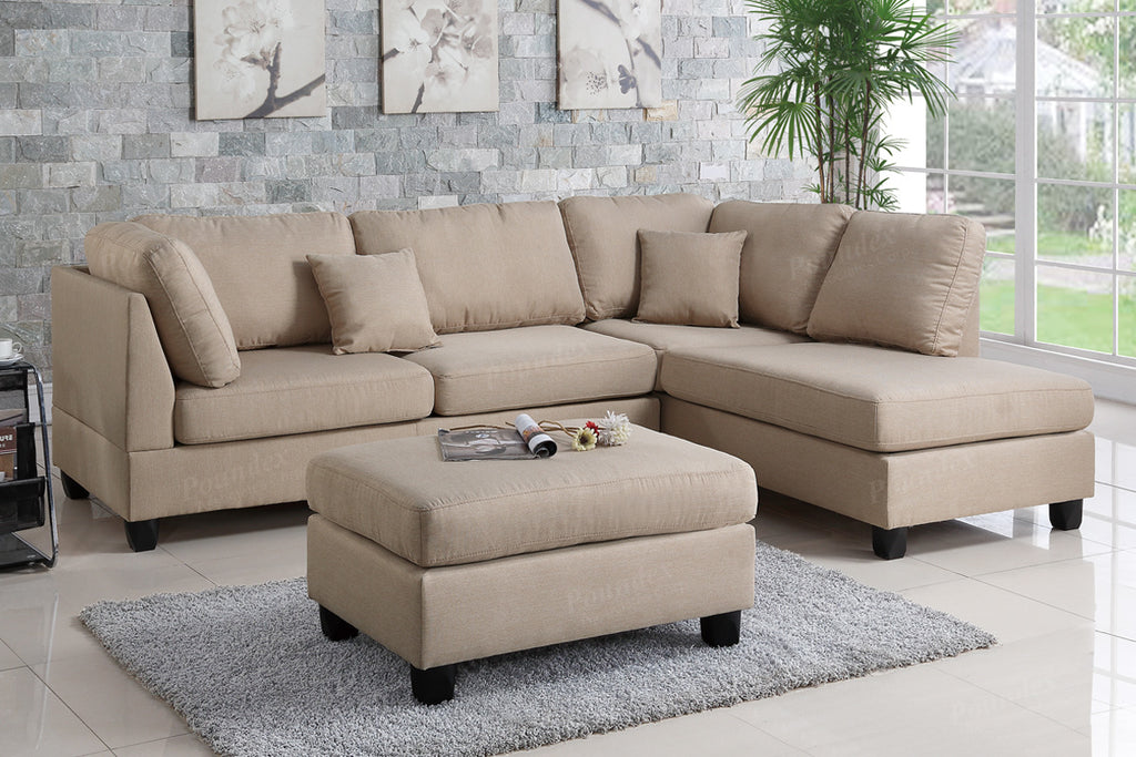 Experience simplicity with this 3-piece sectional with a matching ottoman. Upholstered in a plush linen-like fabric, this sectional features cushioned pillow back and seat supports for maximum comfort, and works perfect in a contemporary or classic styled living room. Available in sand, grey, teal, and chocolate.