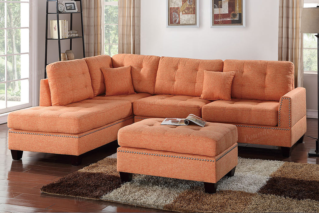 A chic design of fashionable flare is delivered with this 3-piece sectional sofa covered in a smooth but functional fabric. The lower portion is trimmed with nickel finished studs and the seating is of pure, plush comfort. This platform framed sectional also features short wooden legs, accent stitching and a matching ottoman. Available in coffee, blue, or citrus polyfiber.