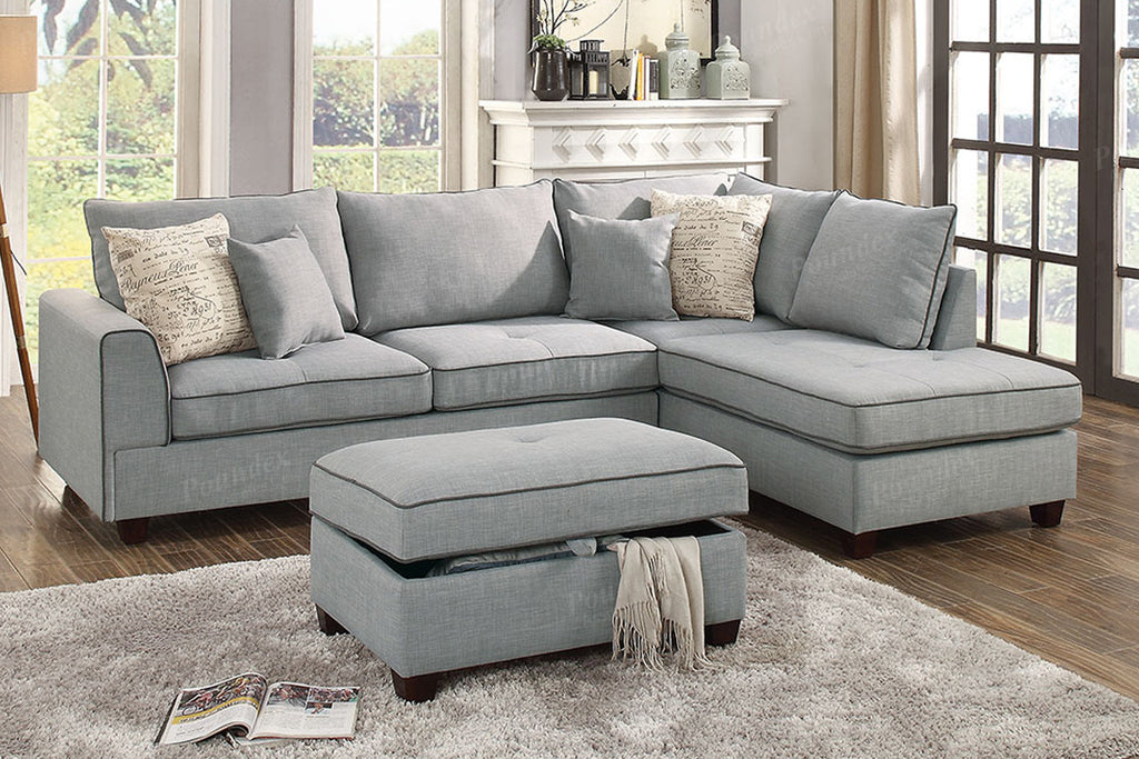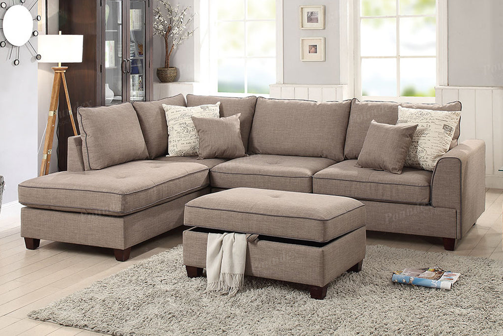 Imagine an ocean breeze on a summer evening with this 3-piece sectional sofa. This beautifully designed sofa collection features a traditional crafted unit with large plush pillows and seating in summer hues. It also includes a reversible chaise and matching storage ottoman. Available in steel, light grey, or mocha Doric fabric.