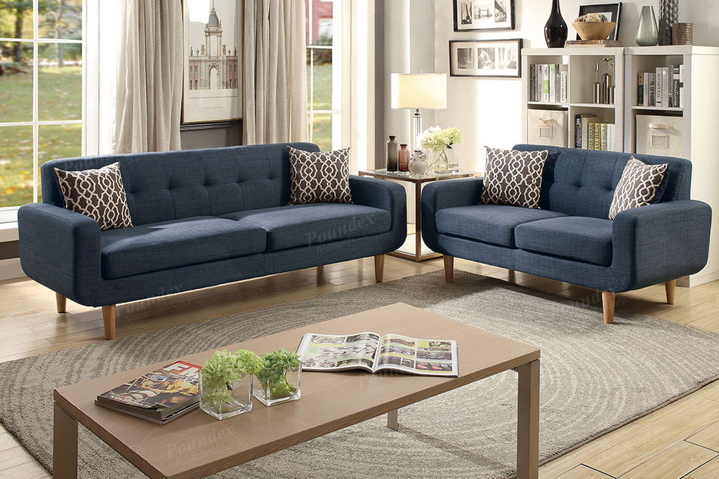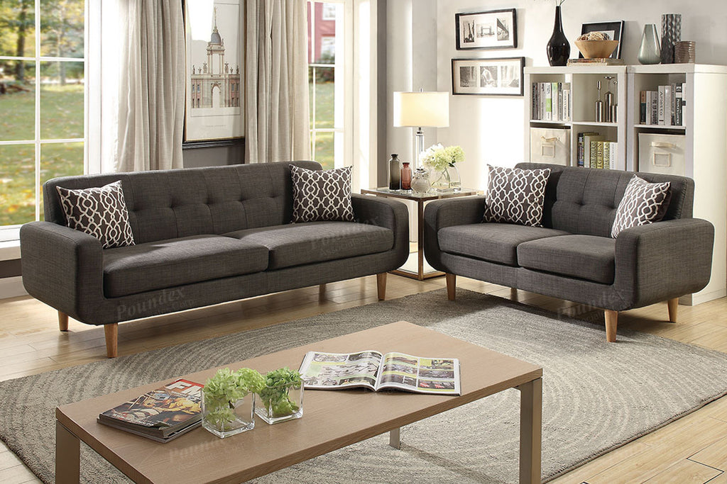 A modern dream comes to life with this 2-piece sofa set dropped in Doric fabric and an elegant frame. It's compact structure features single-paneled seat and back cushions. The set also include accent pillows for a touch of color. Available in ash black, mocha or dark blue.