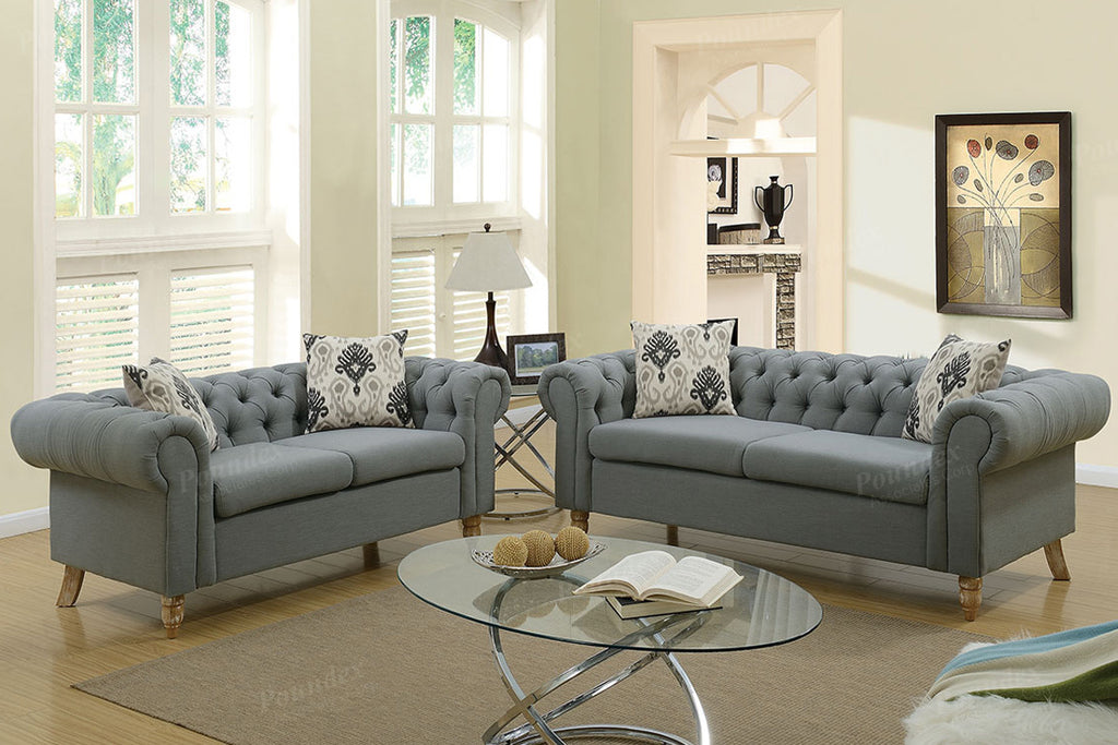This trendsetting 2-piece sofa set will brighten your home living space with its romantic sofas featuring a sleight design with rolled arms and accent button tufting on the back support. This collection sings of spring as its accent pillows provides a lovely contrast to the colors. Available in ash black or sand plush polyfiber.