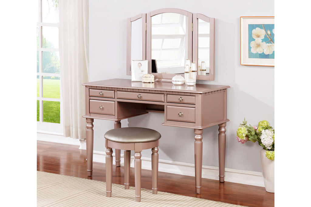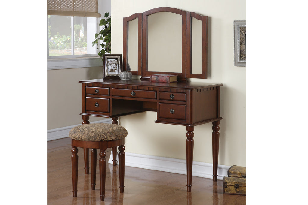 A fluid design of feminine accents and allure, This vanity set collections comes in a variety of wood finished colors. Each table features a foldout mirror with extensions on both sides to catch all the right angles. This also includes five-drawers for storage and a matching stool covered in a lavish plush fabric.