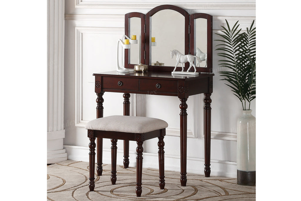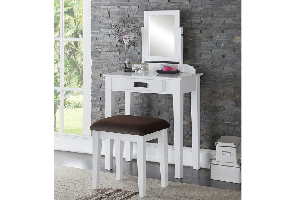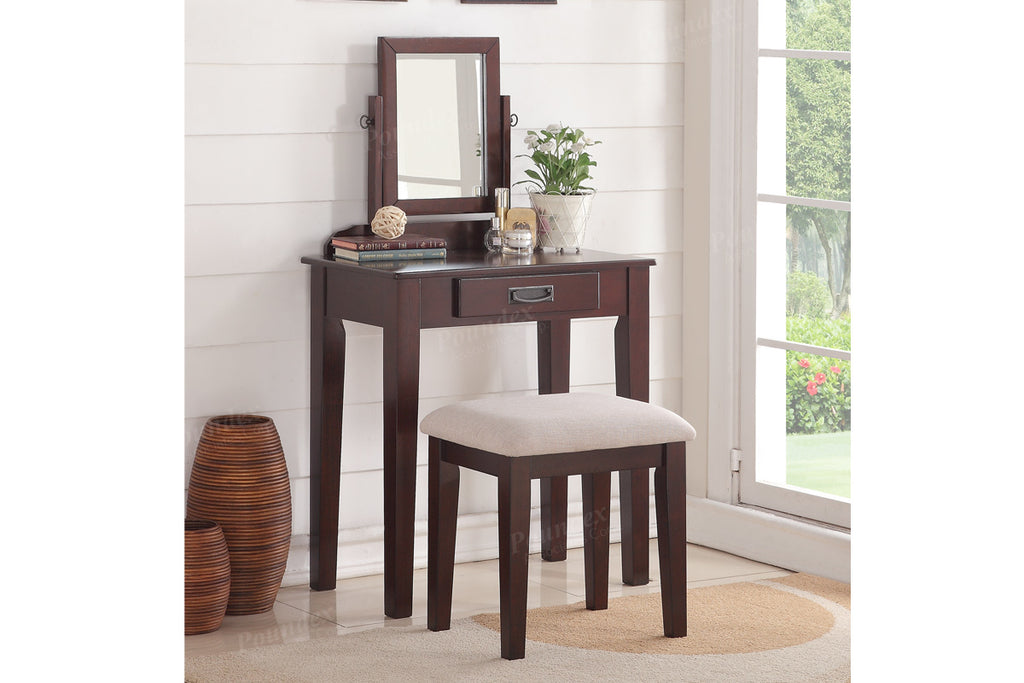 Create a special space in your bedroom to prep for a night on the town with this 2-piece vanity set. It features a rotating mirror, single drawer and cushioned bench. Available in espresso or white.
